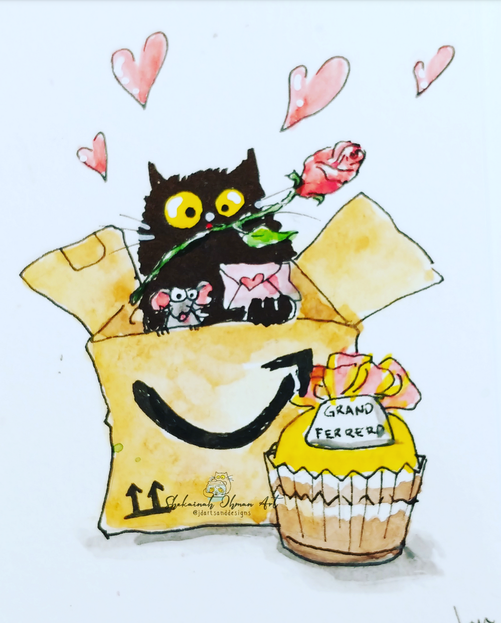 ACEO cat ORIGINAL Valentines black cat mouse amazon box rose gift chcolate funny whimsical miniature 2.5x3.5"/5x7"/8x10"